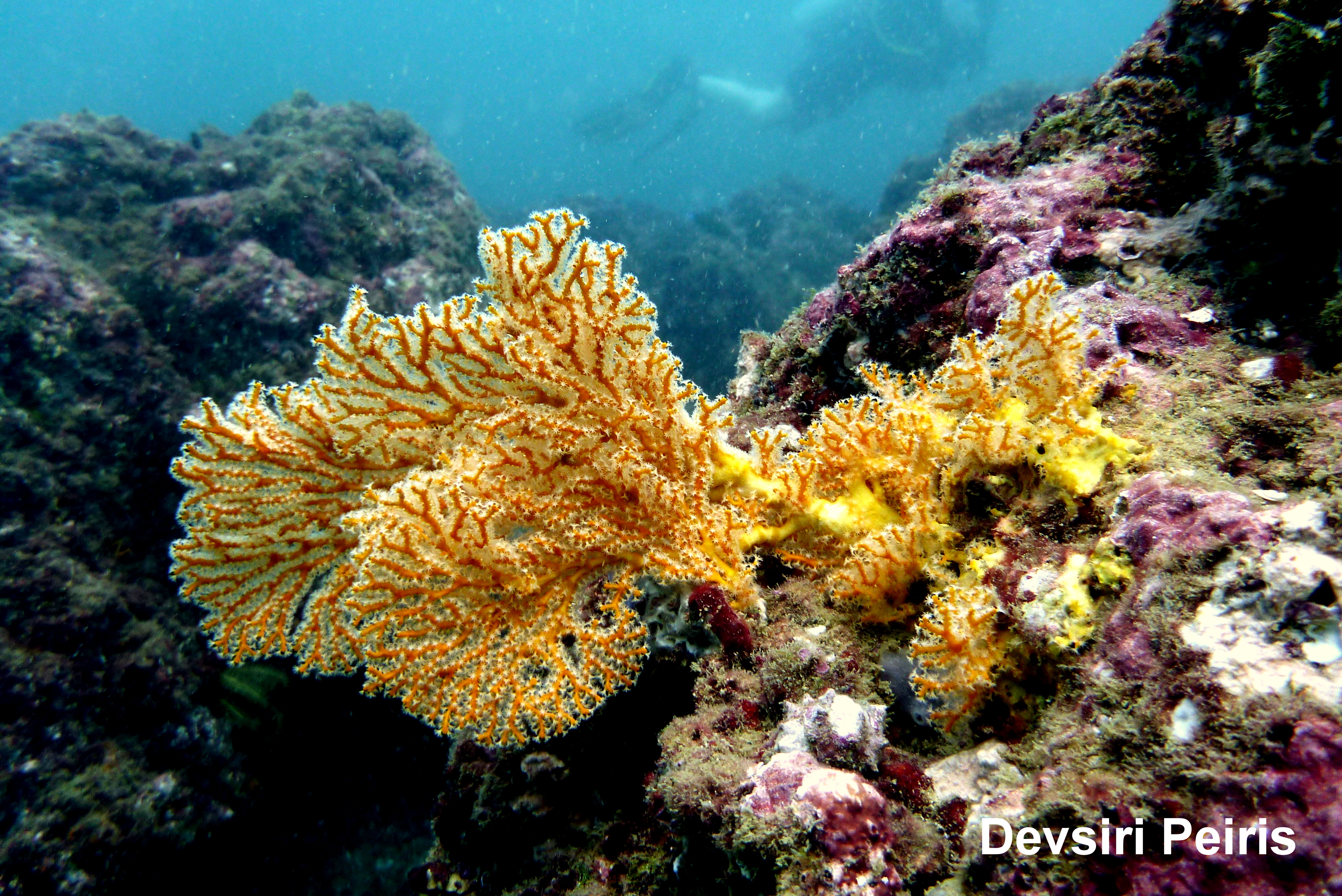 Gorgonacea is an order of sessile colonial cnidarian found throughout the oceans of the world, especially in the tropics and subtropics. Gorgonians are also known as sea whips or sea fans and are similar to the sea pen, a soft coral. Gorgonians are closely related to, but technically not coral, themselves. Individual tiny polyps form colonies that are normally erect, flattened, branching, and reminiscent of a fan. Others may be whiplike, bushy, or even encrusting.A colony can be several feet high and across but only a few inches thick. They may be brightly coloured, often purple, red, or yellow. Photosynthetic gorgonians can be successfully kept in captive reef aquariums. The name “Gorgonacea” is no longer considered valid and Alcyonacea is now the accepted name for the order.