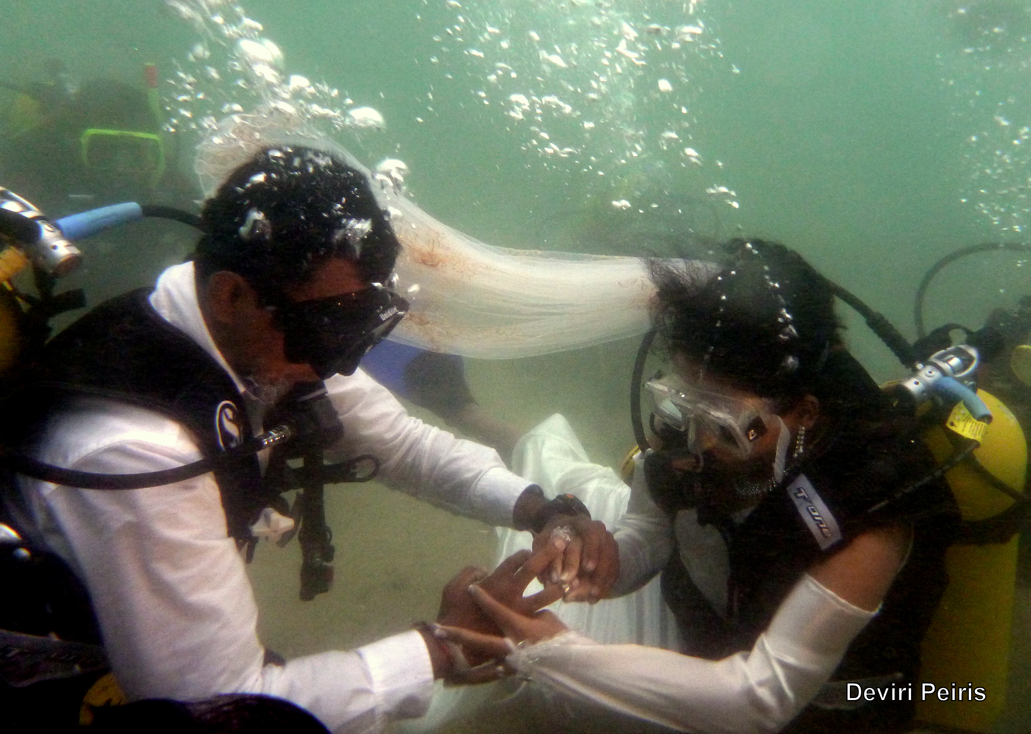 Pinith & Harshani got married in a very exciting & unique way yesterday 4th March 2013. Having learnt Scuba Diving from PADI Instructors Dr. Ranjith De Silva & Devsiri Peiris as well as PADI Dive Master Yohan Abeysekara they decided to take a dive into their new life ahead as husband & wife.